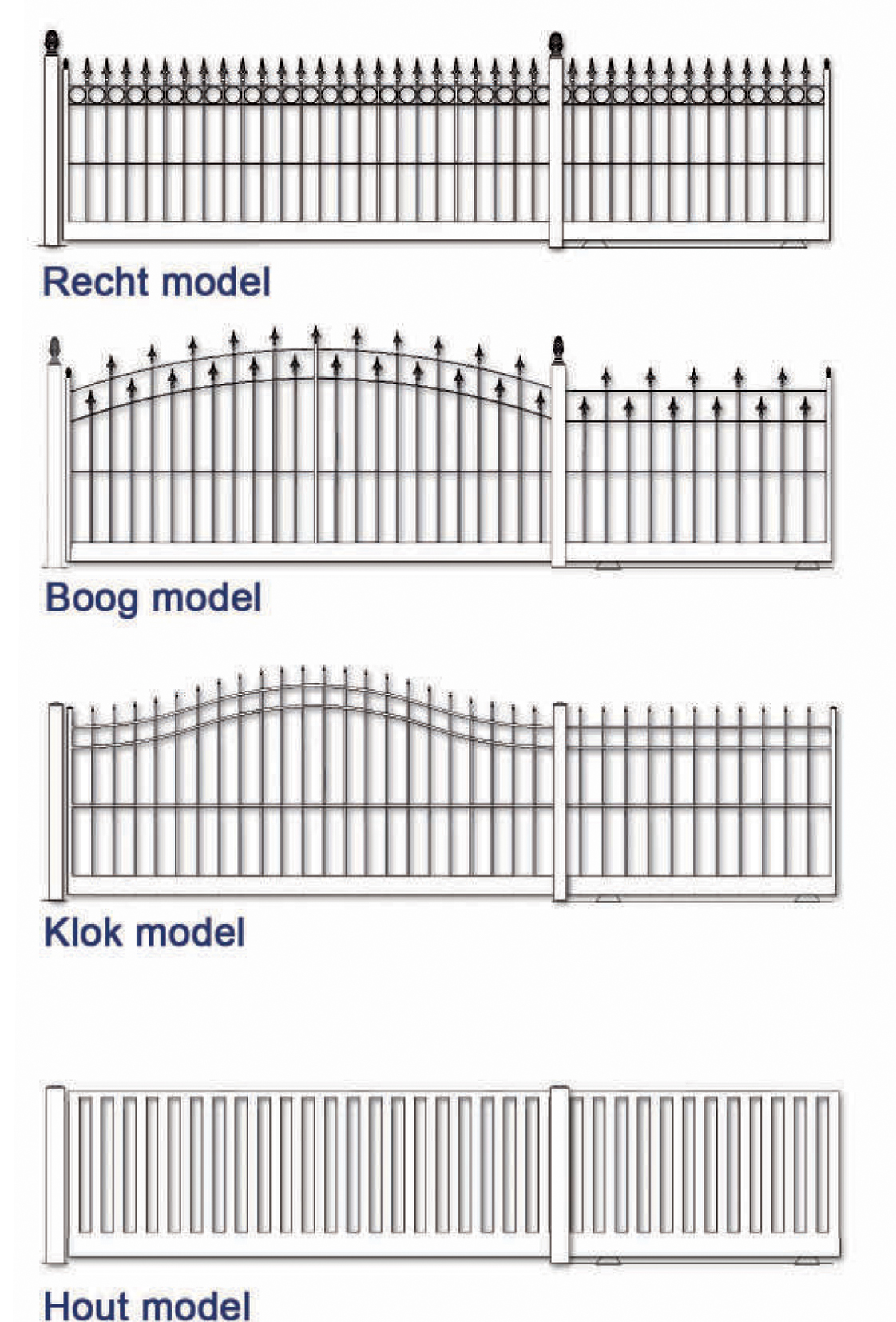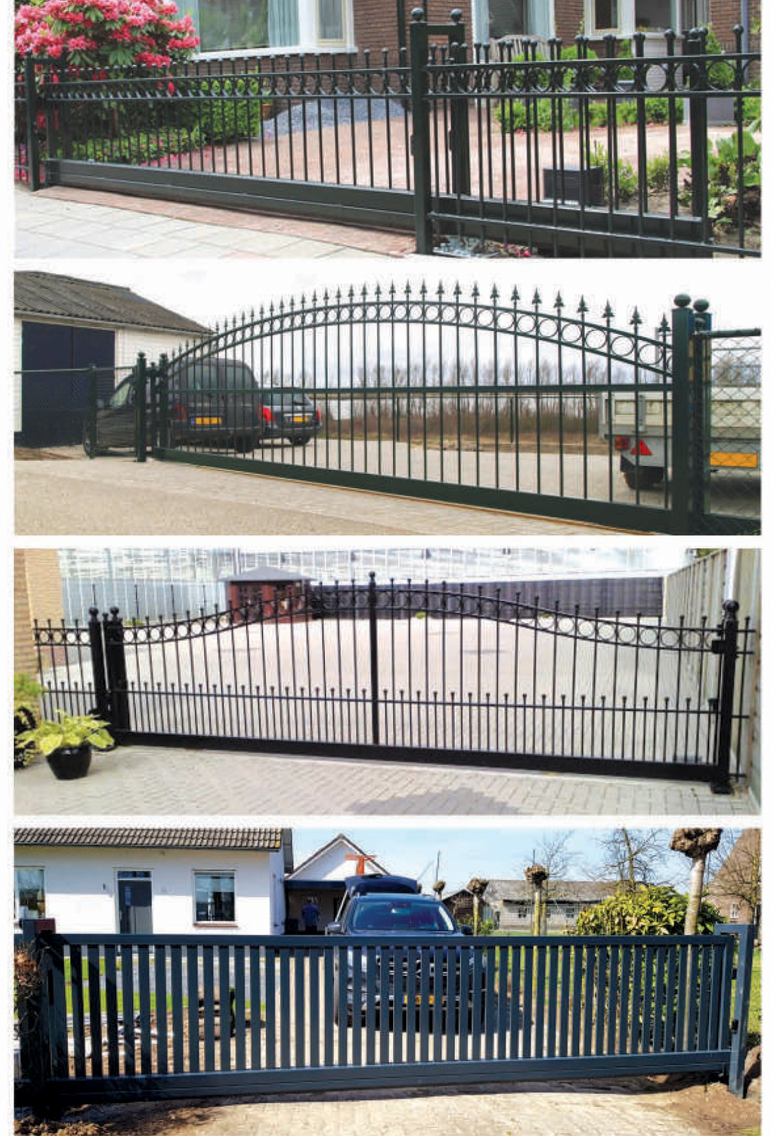 Een schuifpoort is de ideale oplossing wanneer er op het terrein weinig ruimte is om een poort open te laten draaien. Veelal leveren wij elektrische schuifpoorten, zodat u deze op afstand kunt openen en sluiten. Hier geldt ook weer dat de poorten naar uw wensen en op maat door ons gemaakt worden.